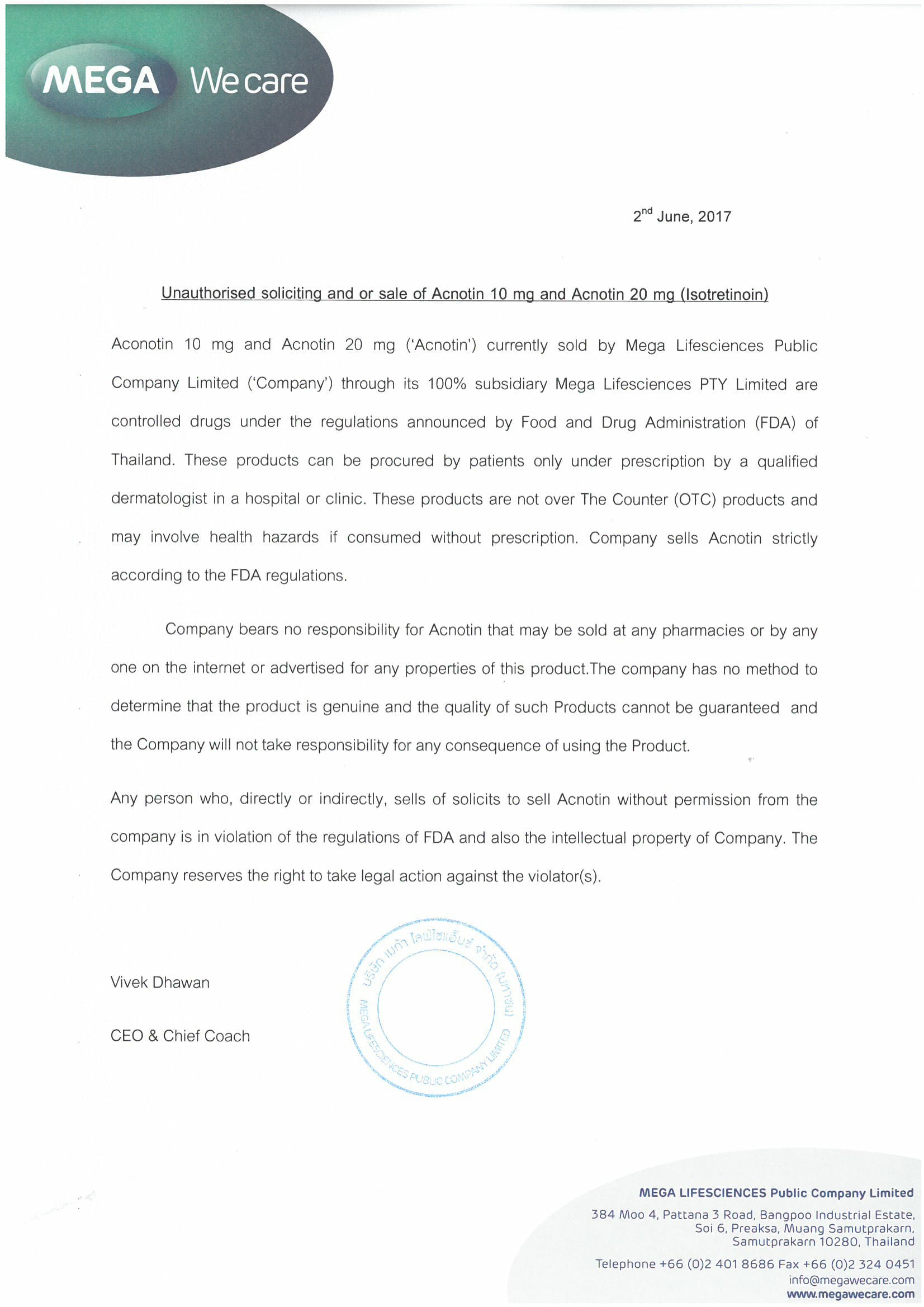 Aconotin 10mg and Aconotin 20 mg ('Aconotin') currently sold by Mega Lifesciences Public Company Limited ('Company') through its 100% subsidiary Mega Lifesciences PTY Limited are controlled drugs under the regulations announced by Food and Drug Administration (FDA) of Thailand. These products can be procured by patients only under prescription by a qualified dermatologist in a hospital or clinic. These products are not over The Counter (OTC) products and may involve health hazards if consumed without prescription. Company sells Acnotin strictly according to the FDA regulations.