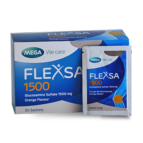 Each sachet of Flexsa 1500 contains 1500 mg of water soluble crystalline glucosamine sulphate, which is a clinically proven supplement for improving joints health. Available in a tangy orange flavour, it can provide relief from joint pain in as little as 2 weeks. One-a-day Flexsa sachet provides long-lasting solutions to your joint pain, overall mobility and discomfort of joints, without any side effects.